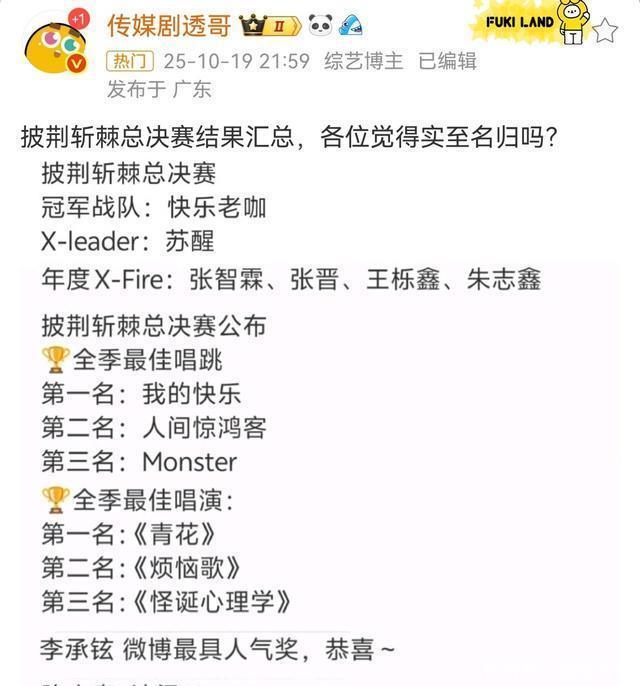 大家都觉得个人冠军应该颁给李承铉,但我觉得除了实力以外,知名度和人气也是节目组需要考虑的,李承铉人气和流量还是要差一些。