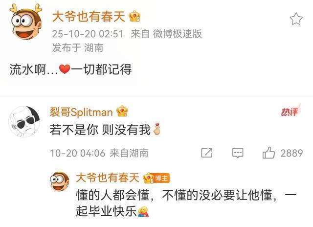 王铮亮用小号发文说:“流水啊,一切都记得。” 苏醒回复:“若不是你,则没有我。” 小亮哥说:“懂得人都会懂,不懂得没必要让他懂,一起毕业快乐。”